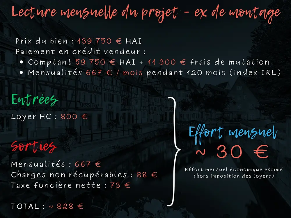 Cette approche permet de raisonner en coût mensuel net, comparable à un investissement locatif encadré.