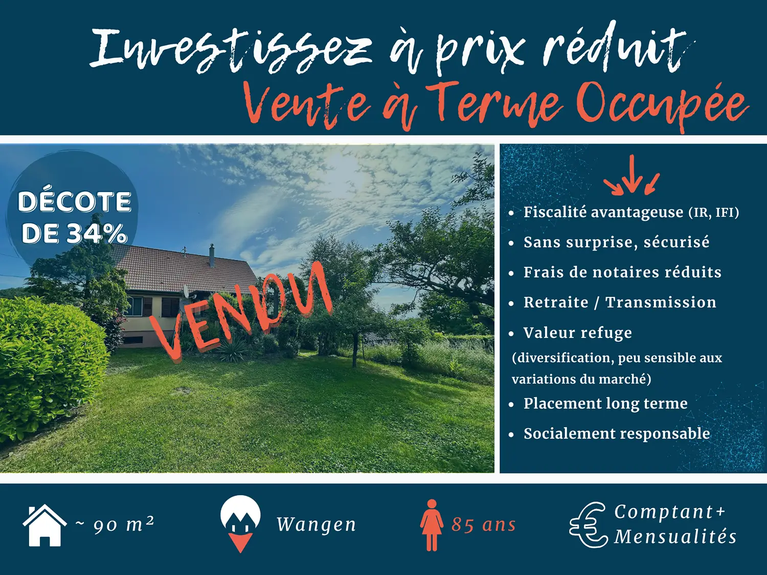 Cette maison de plain-pied de 90 m² sur 1 078 m² de terrain, nichée sur les hauteurs de Wangen dans un village viticole médiéval du Bas-Rhin, a été vendue en vente à terme occupée par Osez Viager. À 1,7 km de Marlenheim et 25 minutes de Strasbourg, une référence dans ce secteur recherché du vignoble alsacien.